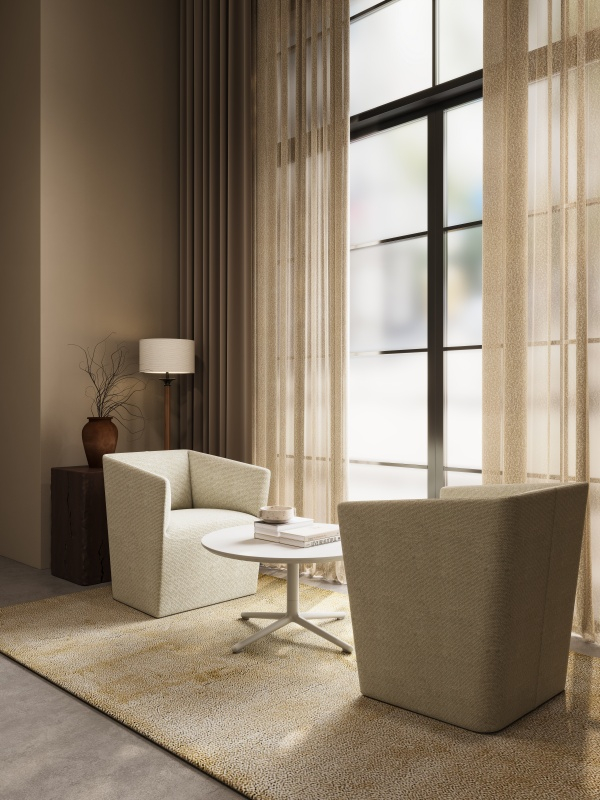 Inspired by the soft texture of bread, the Bread Lounge Chair has a simple shape that offers a warm and comfortable seating experience. Its ergonomic armrests and a smile-like curve on the front of the seat make it look more approachable. With two-tone fabric options, this chair is ideal for various lounge spaces, adding vitality to any room.