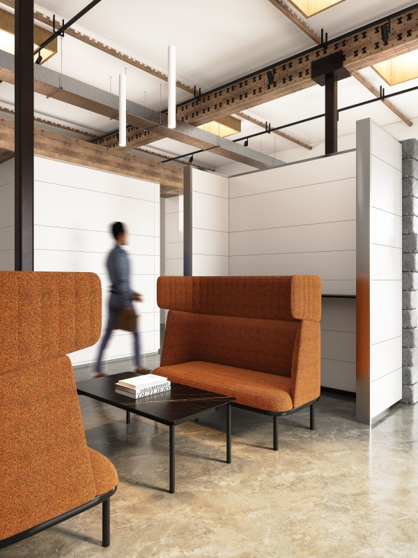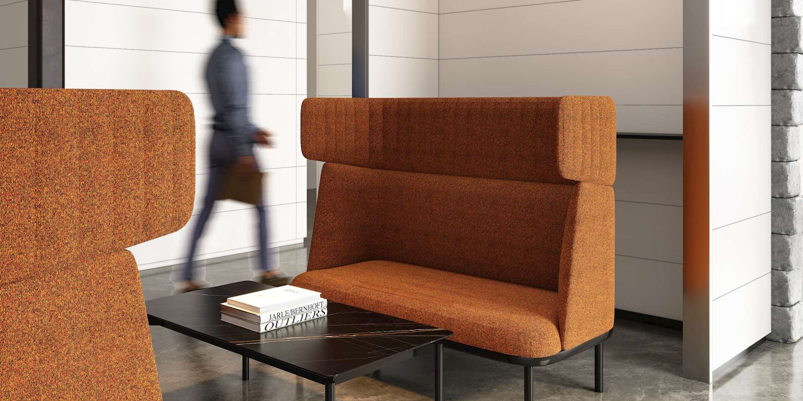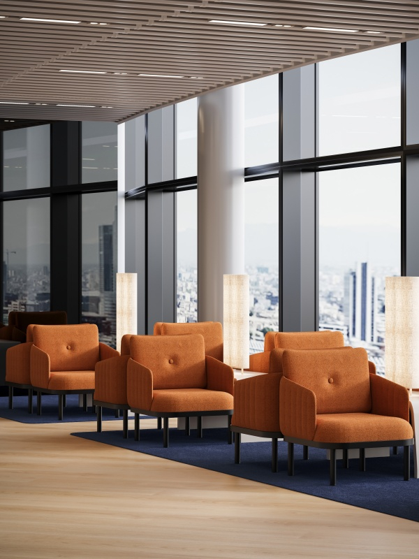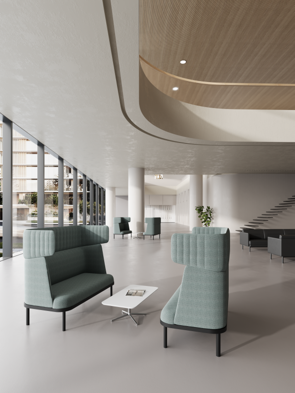 Inspired by the gentle and soft form of a sheep, the Sheep Sofa evokes a sense of security and a desire to embrace it. This sofa is designed with a three-sided enclosure to create a private space ideal for work, relaxation, and conversation, perfectly addressing the need for privacy and acoustic properties in public areas. The headrests feature an embossed texture that provides a comfortable, enveloping feel, while their rounded shape is reminiscent of a sheep's fluffy wool. Additionally, a writing pad can be added for convenient use.